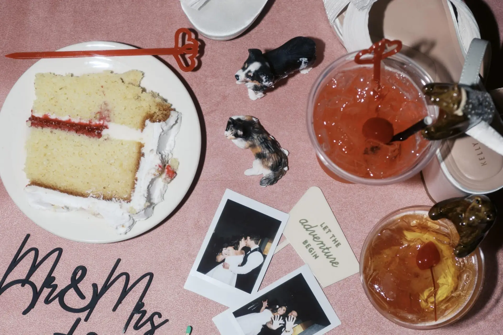 All pieces of a wedding invitation spread out on blue fabric